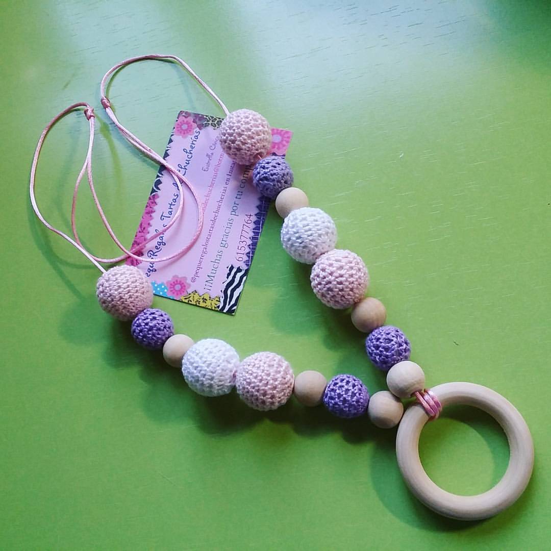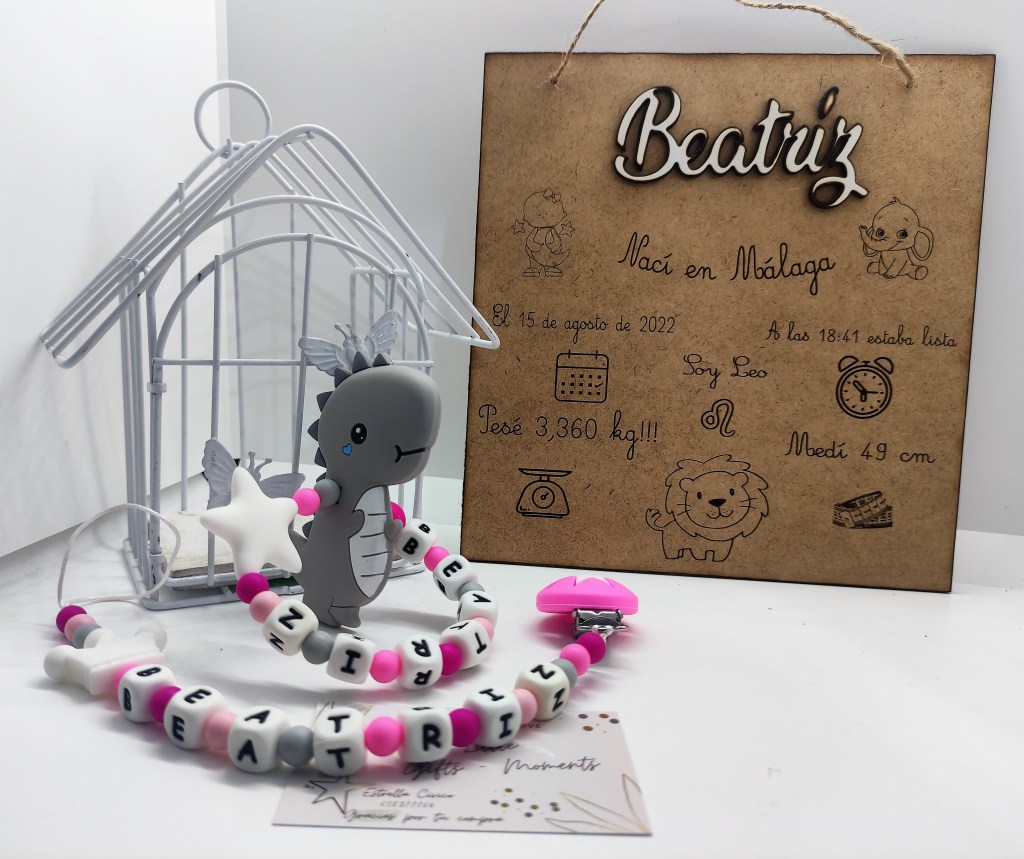 Este conjunto de chupetero y mordedor con la placa de nacimiento es una monada.